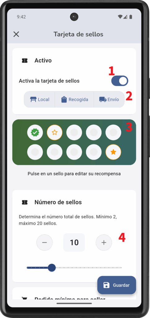 Esta sección te permite crear una tarjeta de sellos, ofreciendo diferentes recompensas cuando el cliente realice un pedido superior a cierto importe.