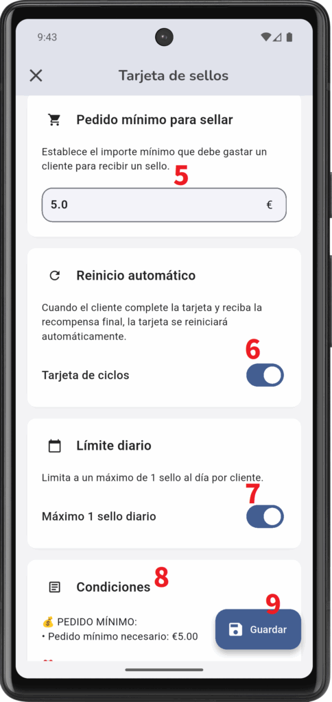 - Reinicio automatico. Al seleccionar esta opción, cuando el cliente reciba el último sello, la tarjeta se reiniciará automáticamente y volverá al primer sello.