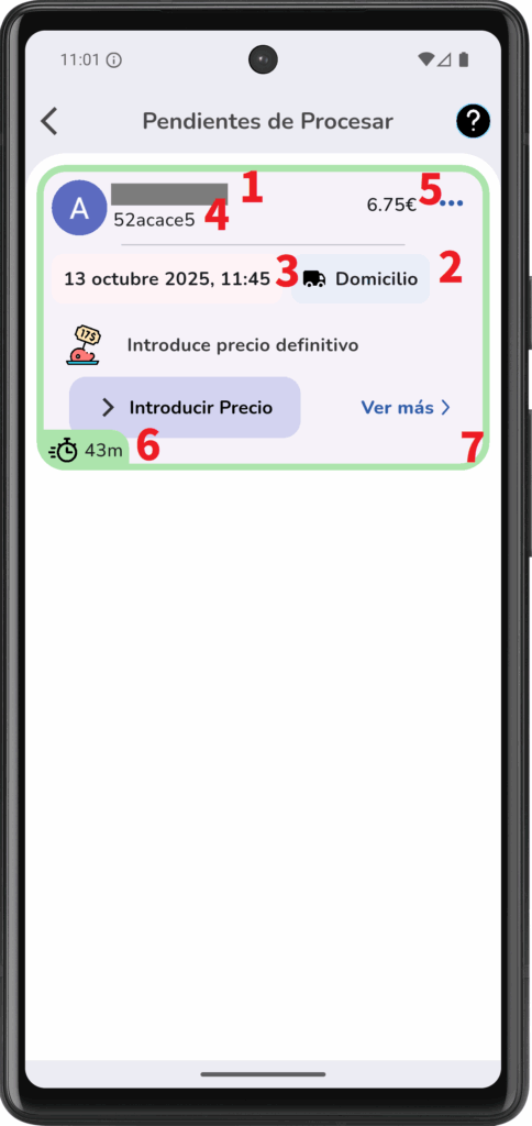 • Información visible para cada pedido: