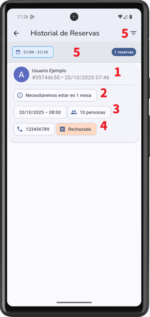 - Teléfono del cliente y estado de la reserva: Muestra si la reserva se rechazó (ya sea automáticamente o manualmente), o se acepto. Si se desea contactar con el cliente, se puede llamar pulsando en su número de teléfono.