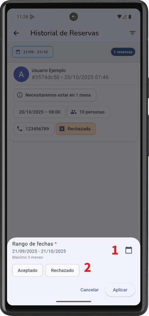 , y te aparecerá un calendario donde debes pulsar la fecha de inicio y de final de filtrado. Al hacerlo, se filtrarán los resultados si están entre el rango de días resaltado en color. Al acabar de seleccionar el rango deseado, pulse al botón «Guardar». - Por estado de la reserva: Permite mostrar todos los resultados (si no se selecciona ninguno de los dos filtros), mostrar solo los resultados de reservas Aceptadas o mostrar solo los resultados de reservas Rechazadas .